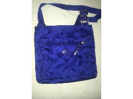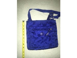 Like new condition without tags. Navy blue. Approximately 9 1/2" H x 10"W with 24" adjustable strap. Zip top closure and one exterior zip pocket