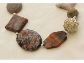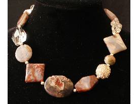 This gorgeous statement necklace oozes sophistication in lavender, rose, caramel and silver. Featuring classic agate and rock crystal. Length is 18-21."