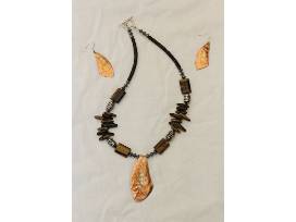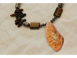 A show-stopper copper and tiger's eye necklace along with copper earrings. Metal is heated to create the color, texture and lacquered beauty of the pendant.