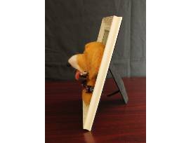 This is pup-tacular! A three-dimensional needle felted relief of a Golden Retriever adhered into a 11" x 14" frame with a 8"x10" opening. The dog is made of wool and has plastic eyes, a handmade clay nose, horse hair whiskers, and even has a felted tongue and teeth. This dog is also wearing a real dog collar. This peace is not a toy and should be kept out of reach from children and pets. Even though it is not fragile like glass, it is to be handled with care and only to be "petted" nicely.
