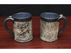 These two large mugs by clay artist Sonya Penn feature dog silhouettes as embellishments and blue glaze inside and on the handles. The outside is black under-glaze wiped back to show texture and the raw clay surface. While these handling procedures won't harm the mugs, best practice is to hand-wash and do not microwave.