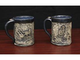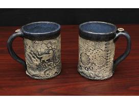Enjoy these two large handmade stoneware mugs with whimsical cat silhouettes, created by clay artist Sonya Penn. The outside is black under-glaze wiped back to show texture and raw clay surface, and blue glaze is applied to the inside and on handle. Best practice is to hand-wash and do not microwave.