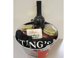 one bottle of 19 Crimes Dark Red (2018) wine, one t-shirt (size small), one beer bucket