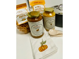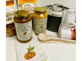 From the Williams Sonoma signature line of high-performance, eco-friendly, nonstick cookware, this Dutch oven is made in Denmark of 100% recycled aluminum reinforced with ceramic-titanium particles and coated with a patented PFOA-free Green Tek nonstick cooking surface. Great for healthy, low-fat cooking using minimal oil, this durable piece is designed for searing and browning followed by slow simmering. Set also includes butternut squash puree and bisque sauces, wooden spoon set, Williams Sonoma kitchen towel set and two packages of Trader Joe's Fall Zucchette pasta.