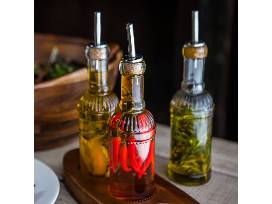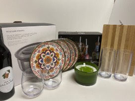 Set includes William Sonoma salad spinner with stainless steel bowl, bamboo cutting board, four Tuscan-style patterned plates, two plastic stemless wine glasses, two drinking glasses, three glass cruets, and coordinating three-wick candle.