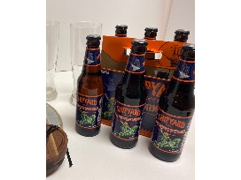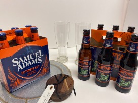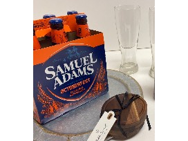 Two six-packs of your favorite fall beers, Sam Adams Octoberfest and Shipyard Brewing Company Pumpkinhead, plus two tall Pilsner glasses. Set those cold ones on the wooden coaster set and serve your favorite cheese and crackers on the galvanized metal plate with gold welding, both from Hearth and Hand with Magnolia.