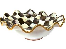 With its bold pattern and lustre-embellished fluted rim, the MacKenzie-Childs Courtly Check Medium Serving Bowl is as handsome as it is handy, whether piled high with a garden salad or filled with your trademark gazpacho. A beautiful juxtaposition of ivory and onyx, the deceptively simple signature checks reveal an intricate spectrum of jewel-toned colors. Handmade, fired, glazed, fired again, hand-painted, fired again, and embellished with lustre, each piece is stamped by the artisans involved in its creation.