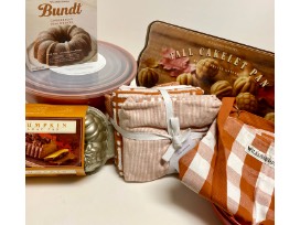Fall baking just got a lot more fun with these festive baking accessories from Williams Sonoma. Your fall desserts will never look better with this set that includes a unique loaf pan, cakelet pan. nesting mixing bowls with lids, apron, and dish towels. Gingerbread cake mix is the icing on the cake!