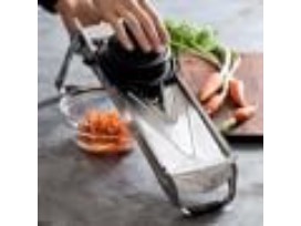 The de Buyer Vantage mandoline not only creates perfect slices and julienne cuts but also includes three different grating blades so you can grate a complete range of foods. Use the coarse grater for potatoes, carrots or cabbage; the medium grater for ginger, Parmesan or chocolate; and the fine zester for citrus fruits or garlic. The V-shaped blade is ideal for slicing soft, delicate produce such as ripe tomatoes.