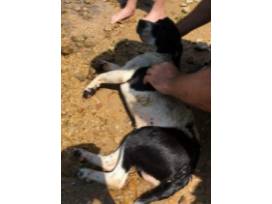 This dog was thrown off of a bridge! He landed on a rock and crawled for help. Luckily a kind family was swimming nearby, saw the whole thing, and rushed to his aid. He was kept overnight in a nearby clinic until he was stable enough to travel to our trauma center. He had a left rear hip luxation with a bone fragment in the socket, his left front shoulder was injured but not fractured, and he had pneumothorax (a collapsed lung).