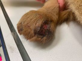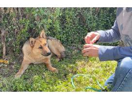 Our rescue dispatch team takes some of the hardest phone calls imaginable, and the call they received about Sir Attenburough was one of those. When we arrived at this particular scene we found a beautiful shepherd hiding behind the caller's house. We could tell he was very fearful, but Donna talked sweetly to him and inched closer while offering her secret weapon: vienna sausages. The dog was hesitant at first, but he let her approach him and put on a leash. When he stood up, we were shocked. His rear leg was just a bloody stump - to this day we still don't know what happened to his foot. He was still trying to walk on it which was incredibly painful for him. We chose the name Sir Attenburough because his rescue took place on Earth Day.