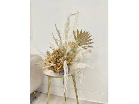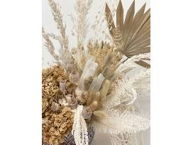 A stunning preserved floral arrangement using neutral tones and added Selenite stone. Selenite is a calming stone that instills peace and positive energy.