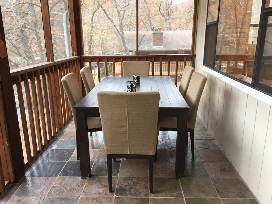 Main level is an open floor plan featuring a large fully equipped eat-in kitchen, separate bar and beverage fridge and living room that walks out on to huge screened porch. Living room has plenty of seating, flat screen TV with Blu-ray player and free standing wood fireplace. Screened porch has a seating area and additional dinning space. The master bedroom on the main floor has a Queen size bed. Main level features large brand new bathroom. Washer and Dryer as well as kid-necessities like pack n play and high chair available for use.