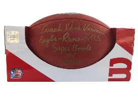 Add to your sports memorabilia collection with this official Wilson NFL football autographed by Superbowl winning NFL coach and TV personality Dick Vermeil. Inscription reads: "Coach Dick Vermeil, Eagles-Rams-KCC, Super Bowls XV, XXXIV". What Eagles fan and NFL enthusiast wouldn't want to bid on this? The autograph alone is priceless!