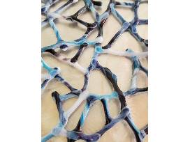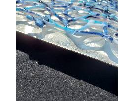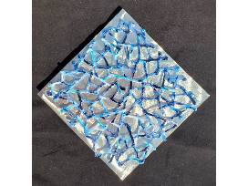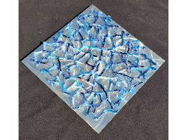 A truly one-of-a-kind piece, this handmade fused glass wall hanging is mounted on a 14" x 14" stainless steel plate.