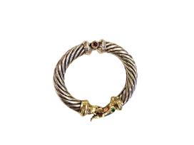 1Everybody loves David Yurman. Add some bling to your collection with this ladies Sterling Silver and 18 Karat yellow gold bangle bracelet by David Yurman. It contains two round cabochon cut Emeralds measuring approximately 3 millimeters each, weighs approximately .10 Carat each, Color: medium-dark green, Transparency: semi-opaque, and two round cabochon cut Rhodilite Garnets measuring approximately 3.75 millimeters each, approximately .20 Carat each. ColorL dark red, Hue: red/purple, Transparency: Fine, weighs approximately 50.26 grams.