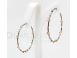 The Yellow Gold Mixed Metal Diamond Hoop is a custom design by Cindy Ensor Designs. It is one of our top sellers. The earrings are made of oxidized sterling silver with yellow gold and diamond accents on the entire hoop. The hoop size is 1.5 mm.