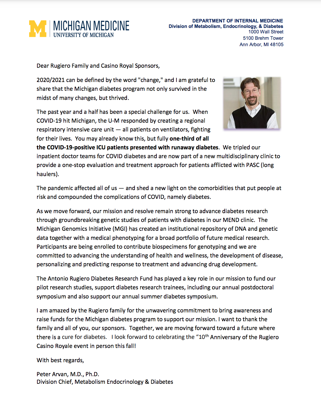 We are pleased to invite you to participate in the 10th Annual Casino Royale! An exciting in-person and online event on October 9, 2021 at the Ford Community and Performing Arts Center. We believe you will find this year's Casino Royale celebration uplifting and hopeful as we gather to fight Diabetes and accelerate focus to improve, prevent, and cure this disease. Casino Royale is a signature event benefitting the University of Michigan Medicine Center and their cutting-edge research in Diabetes.