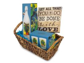 Basket includes Vincent van Gogh uniquely decorated glass bottle and matching drinkware.