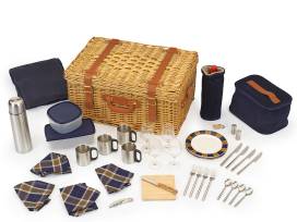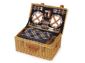 If we've learned anything these past months, it's the importance of slowing down and enjoying life. This navy Windsor wicker picnic basket for four with all the accessories you'll need is perfect for those all-too-infrequent occasions. It includes porcelain plates, white with navy and khaki plaid on the rim; hand-blown 7-ounce wine glasses; 4 forks, knives; 1 cheese knife; 1 waiter-style corkscrew; a Windsor zipper-top wine duffle; hardwood cutting board; 1 bottle stopper; 1 salt shaker; 4 napkins; 1 insulated cooler; 1 vacuum flask; 4 coffee mugs; 2 food containers and 1 fleece picnic blanket.
