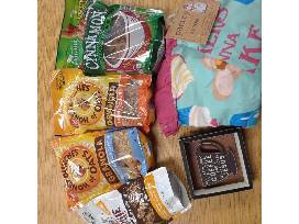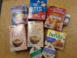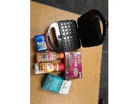Various breakfast drinks, syrup, breakfast bars, waffle maker