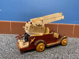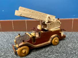 This is a beautifully crafted firehouse and fire engine made by our own woodworker, Stoney Stoneman. What child wouldn't love to play with these two items. The doors on the firehouse open and close. The ladder on the fire engine extends to 18" high. The fire engine has four firemen attached-2 in front and 2 in back.