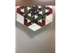 Two coordinating Christmas table toppers for a dog lover. The runner is 42" long x 15" wide. The hexagon topper is 23" from tip to tip. Both are cute puppy print mixed with pieces in red, green and white.