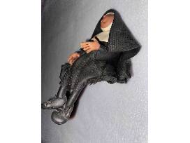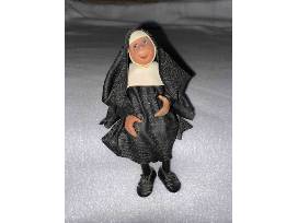 Sr. Zita has donated three cute "Nun" statue. This is the first. This nun can sit on the edge of a shelf or counter. The statue is 5 1/4" from the tip of her toes to the top of her veil and is 3 1/2" wide at its widest point. The second pic shows how the statue is curved to fit on a shelf.