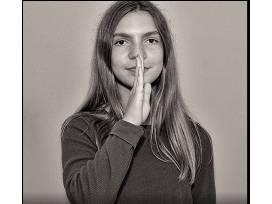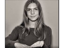 This is a lenticular image portraying a young girl urging us to "be nice", in the gestures of American Sign Language