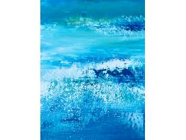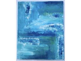 Jorja was painted with palette knives. The mix between the horizontal and vertical movements of the palette knives allows the piece to have a sense of movement. The white streaks contrasting the different tones of blues and green allows the eye to notice the details of the final white layer.