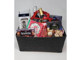 Take time to relax in front of the fire this holiday season while enjoying some wine and snacks. No need to go digging through the cupboards for anything but an opener for the wine. Choose between the bottle of Chardonnay or Cabernet for the evening. This basket has two glasses, a wine carrier, wine topper, plates for your snacks, and napkins to keep you clean.