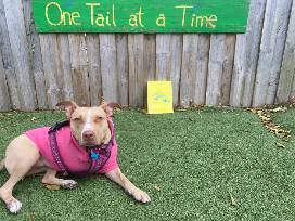 Gilda was rescued from Chicago's animal control in 2019. She was quickly dubbed a "wild child" due to her very exuberant play style and endless energy. Gilda had a front leg deformity that was causing her a lot of pain, so OTAT arranged to have her leg amputated. After her surgery, Gilda's demeanor changed and she became a much more calm and joyful pup. Gilda went to a foster home and continued to thrive, convincing her long time foster family that she was there to stay!