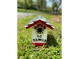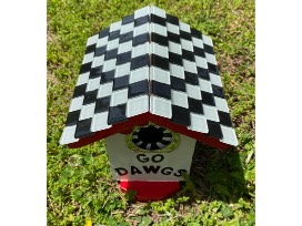 The University of Georgia, handcrafted birdhouse made with wood, paint, and tile by Carol Cooper. The birdhouse is brightly colored with a black and white checkered road surrounding so the birds can find their way home.