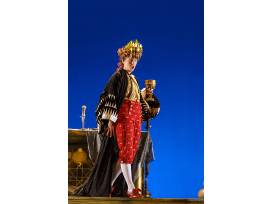 The crown is designed and created by Pittsburgh Opera's own Jason Bray, Head of Costume Design. The crown is accompanied by a copy Jason's original 11 by 17" rendering of the character's costume and sample fablics.