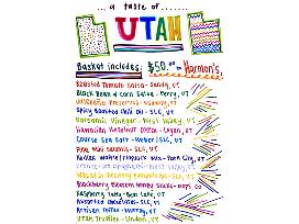 Thank you Kimi Miyashima for putting this amazing basket of goodies together! Enjoy all the tastes of Utah with this basket filled with Roasted Tomato Salsa, Black Bean & Corn Salsa, Jalapeno Preserves, Spicy Roasted Chili Oil, Balsamic Vinegar, Hawaiian Hazelnut Coffee, Coarse Sea Salt, Fine Mini Salamis, Kodiak Waffle/Flapjack Mix, Bronze-Cut Spaghetti, Wasatch Brewery Pumpkin Ale, Blackberry Blossom Honey Sticks, Raspberry Taffy, Assorted Chocolates, Artisan Toffee, Utah Truffles, all of this AND a $50 gift card to Harmon's!