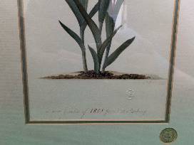 This print has the signature of the original artist who illustrated and painted the purple iris at its original discovery as a species in 1758.