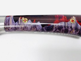 The handmade handle by woodworker Cary Sasaki is dyed purple maple burl with red resin. Bolster pins inlay with crushed opal.