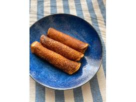 Known as chinbin (rolled Okinawan crepe), this treat includes kokuto, a nutritious Okinawan black sugar made from local island sugarcane with a natural licorice sweetness, combined with mochi (glutinous rice) flour.