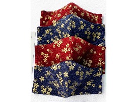 The elegant Red and Blue colored masks are patterned with gold threaded cherry blossoms and a water design accenting the background. Fabric is from Japan.