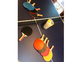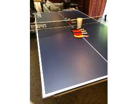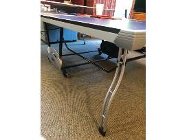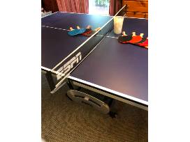 ESPN Folding Ping Pong Table w/9 Paddles, balls, net. Table TennisSpecifications: ESPN Ping Pong Table, folds in half for storage. 9 Paddles ( 2 have faces drawn on them :-)) Two flaws: little safety strap that holds it together upright when folded has broken. One weld has failed, see pics. Doesn't really affect performance.
