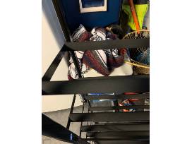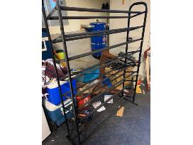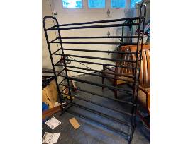 Black metal shoe rack with padded bars. Large capacity, 45" long and 50" tall.