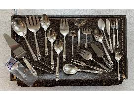 12 each unless noted: Soup spoon, teaspoon (24), salad fork, medium dinner fork, large dinner fork, knives, Iced tea spoons (16), butter knives, demitasse spoons (11), and cocktail forks.
