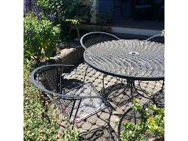 5 piece Outdoor Dining Set (wrought iron) Specifications: 5 piece outdoor dining set in wrought iron. Umbrella can be inserted in the middle of the table. Table 42 inches in diameter.