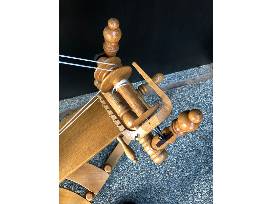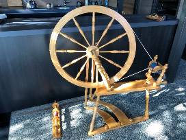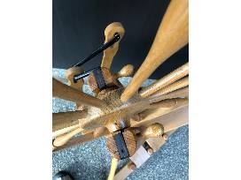 Handmade Oak Timbertops Sherwood Spinning Wheel, double treadle, flyer on the right, interchangeable whorls for 6 ratios from 10-20/1, 4 bobbins and lazy kate. Wonderful tool that can create any sort of yarn with ease. Breaks down into 3 pieces for transport.