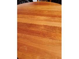 Mission-style Cherry Dining Table and 4 Chairs Pedestal dining table. Round with an extension to an oval (two extensions included). Approximately 4' around when not extended. Solid wood in light natural cherry. Four highback chairs with upholstered seats in a green textured fabric. Some scratches on pedestal and chairs as shown. Specifications: Two extensions