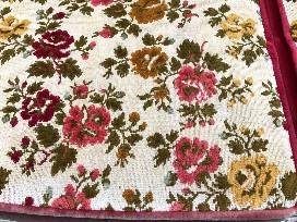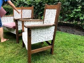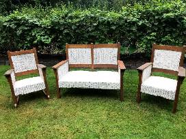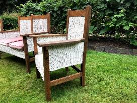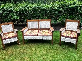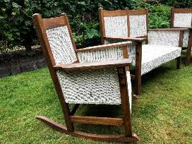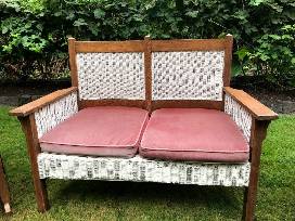 Charming 3 piece matching antique oak & wicker furniture set. Have used as our 'outdoor' furniture for many years on our 100% covered front porch. Reversible deep red velvet cushions w/ floral pattern on the reverse. Very sturdy furniture, great stability and nice flat arms to hold drinks or dishes. A rare find for the collector looking for a matched set. Set could use some steel wool and oil on the oak, but not bad.