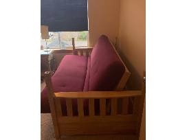 Really cool natural finish solid wood futon bunk bed in great shape. Provides optimal sleeping options to save space. Twin bed mattress fits on top. Futon can be used as a couch or double size sleeping mattress. Futon has a burgundy colored cover. This bunk bed is in excellent shape with all parts and instructions. Seller is the original owner. Some assembly required. Twin mattress for the top not included.