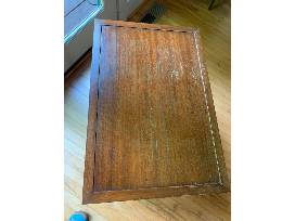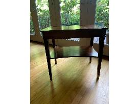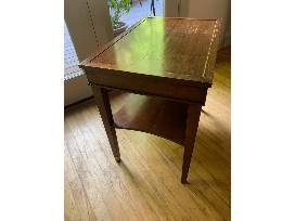 0Mahogany wood end table with shelf. Length: 25 in. Width: 17 in. Height: 24 in.