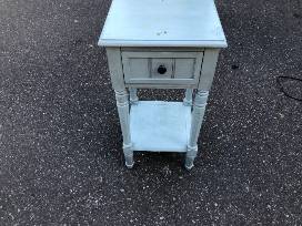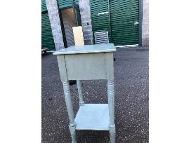 0Small Side Table Nice side table with drawer and shelf. Painted a nice blue/grey color. Length: 14 in. Width: 14 in. Height: 28 in.