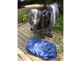 Older Maclaren stroller for twins, gray, with zip-on accessories for cold weather.